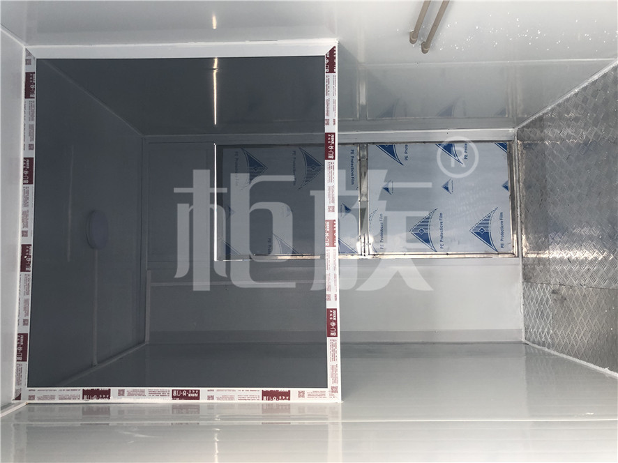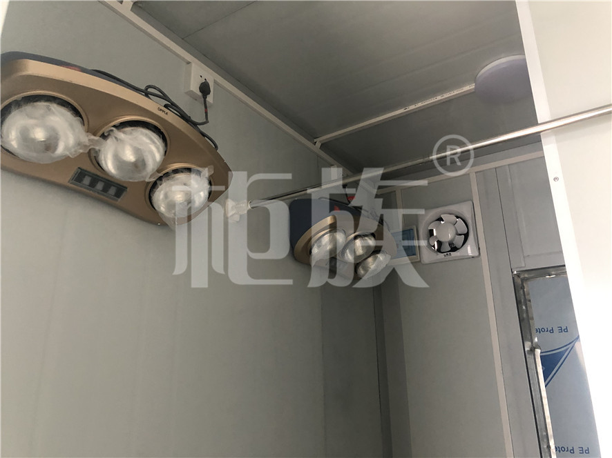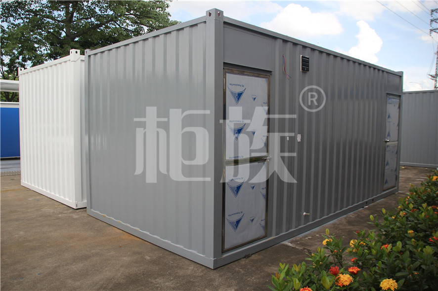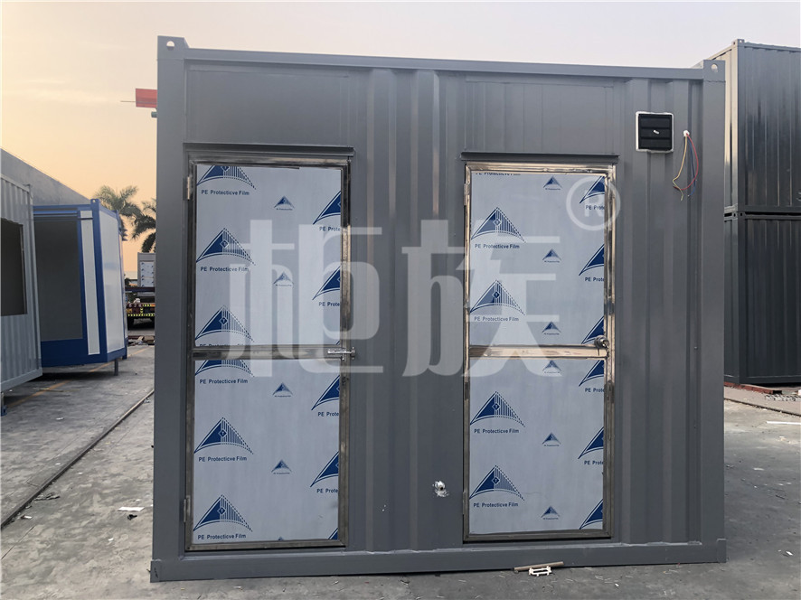 Materials: galvanized rectagular steel tube frame, A-class large corrugated sandwich wall panel, stainless steel door, aluminum pattern floor.
